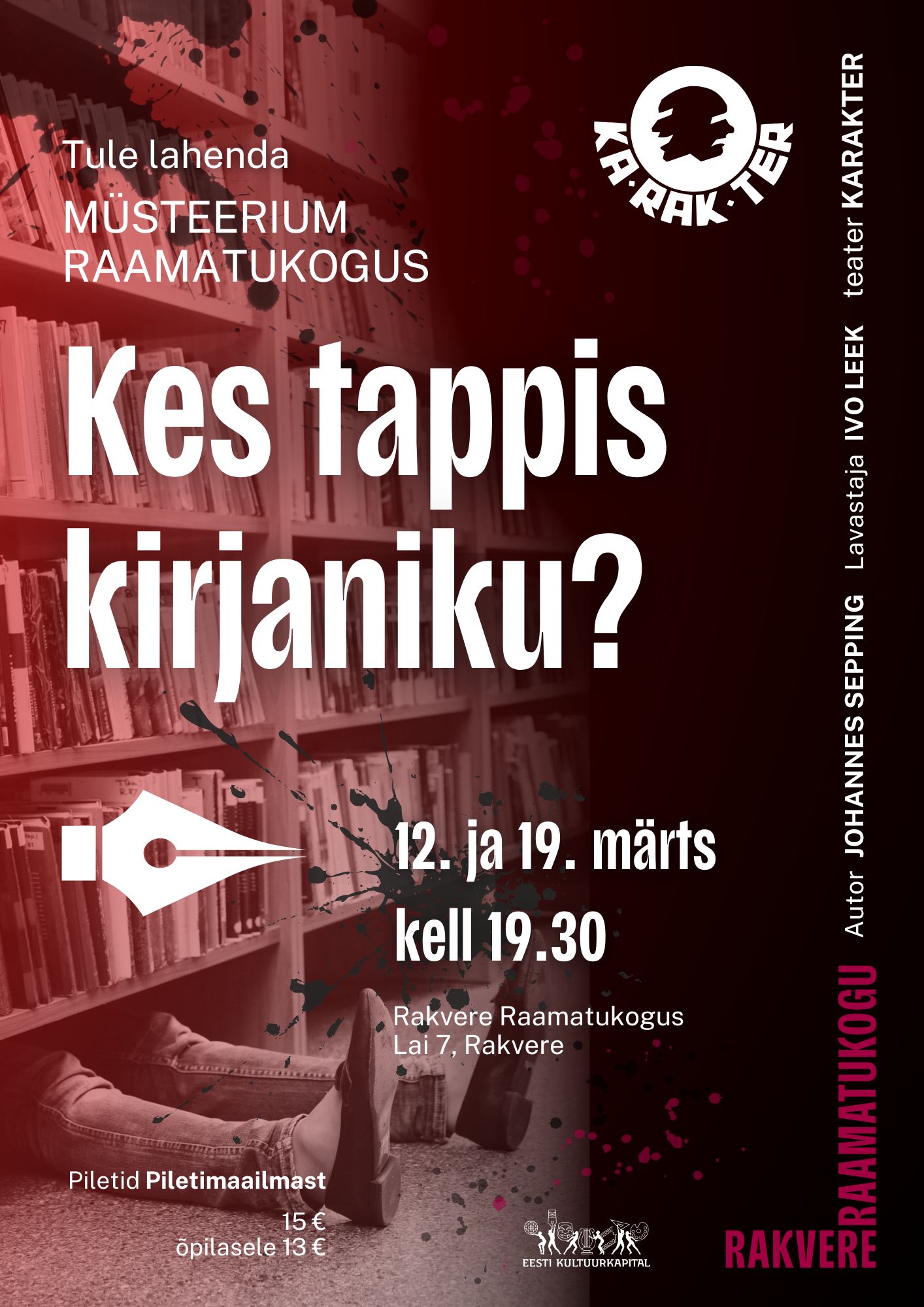 Kahel õhtul muutuvad Rakvere Raamatukogu hubased ruumid pimedateks koridorideks täis salapära, närvikõdi ja ootamatusi, kus publik peab üheskoos lahendama sealsamas toime pandud kuriteo. Kuna tegu on müsteeriumiga, ei saa me liiga palju ette öelda, mis saama hakkab. Olgu vaid öeldud, et lisaks publikule on majas veel 8 näitlejat ning üks nendest on kuriteo autor.